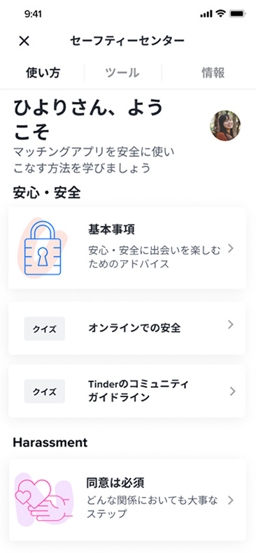アプリに含まれているTinderのセーフティーセンターは、安全やプライバシーに関する国別のリソースや記事、ヒント、クイズ、情報などによって構成されたインタラクティブなコンテンツです。「設定」またはチャット中に表示される「セーフティーシールド」のマークからアクセスすることができます。セーフティーセンターは、メンバーの安全を守ると同時に、メンバー自身がアプリ内またはオフラインのデートで自分の身を守ることができるよう啓発する目的で、Match Group諮問委員会やパートナーのNGOの協力により開発されました。