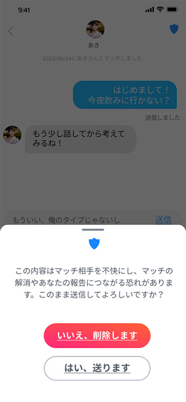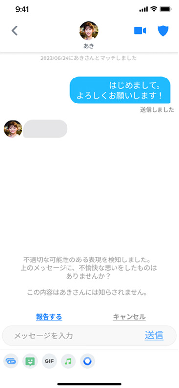 Tinderで不快な思いをする可能性があるメッセージを受け取ると、迷惑メッセージ防止機能と同様に、メンバーには「メッセージに不快な思いをする内容がありましたか?」という質問が表示され、「はい」と回答すると、メッセージの送信主を報告するかどうかの選択肢が表示されます。この機能によって、ハラスメントの報告数が増加しました。