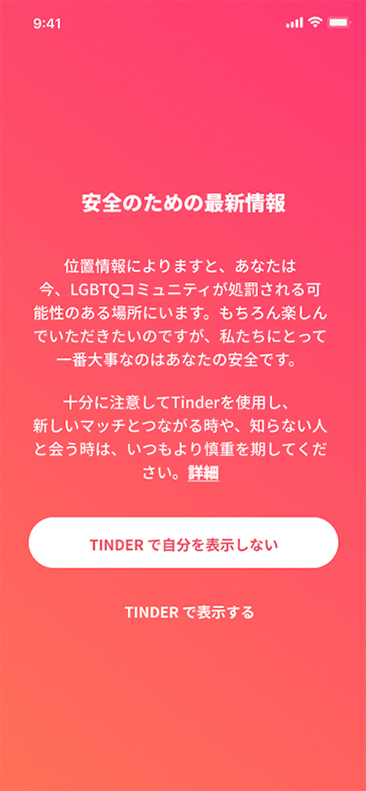 LGBTQIA+のメンバーがオフラインでLGBTQIA+のコミュニティを罰する法律を敷いている国に旅行したり、Tinderのパスポート機能を使ってそういった国でスワイプをしようとすると、注意が表示され、その地域でプロフィールが表示されないようにすることができます。Tinderは旅行中に出会いを求める上でもとても役立つアプリですが、何よりも安心・安全を優先します。